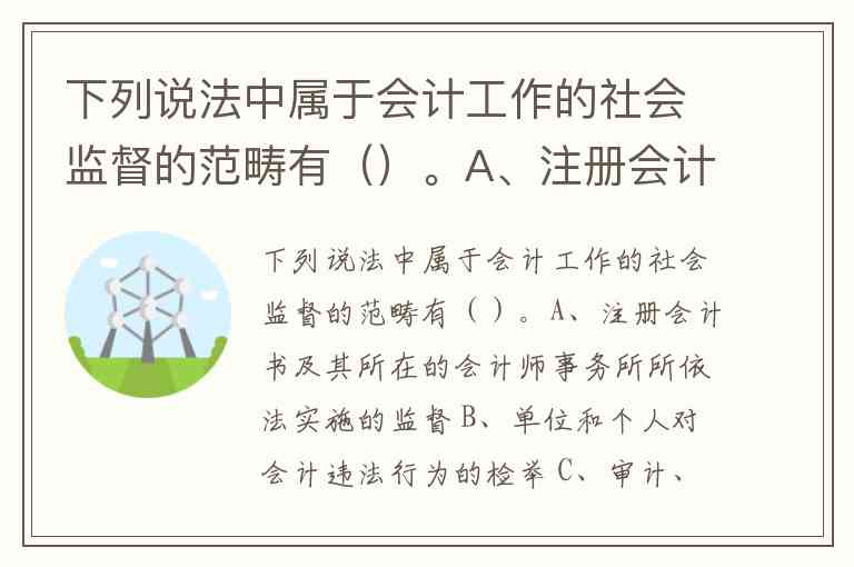 下列说法中属于会计工作的社会监督的范畴有()。A、注册会计书及其所在的会计师事务所所依法实施的监督 B、单位和个人对会计违法行为的检举 C、审计、税务和人民银行依法实施的监督 D、注册会计师的社会监督具有权威性
