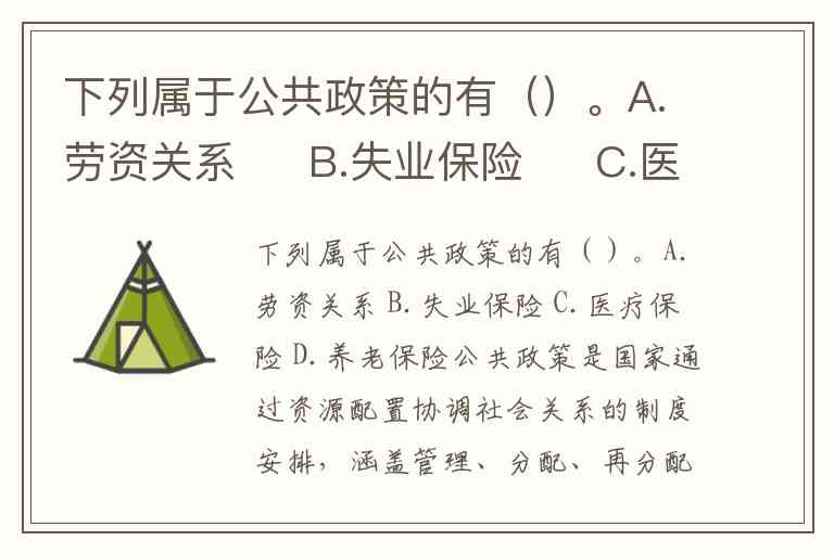 公共政策是国家通过资源配置协调社会关系的制度安排,涵盖管理、分配、再分配和立法四大类。根据这一定义,题目中B.失业保险、C.医疗保险、D.养老保险均属于公共政策范畴,而A.劳资关系本身是社会关系而非政策。