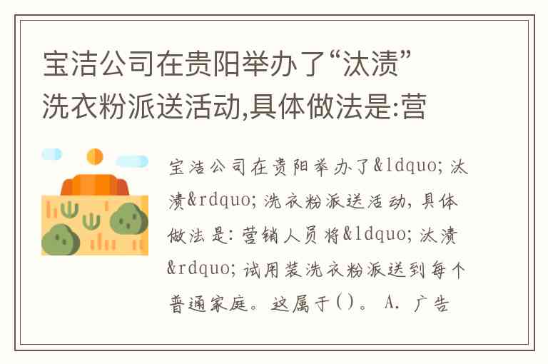 宝洁公司在贵阳举办了“汰渍”洗衣粉派送活动,具体做法是:营销人员将“汰渍”试用装洗衣粉派送到每个普通家庭。这属于( )。 A. 广告促销 B. 人员推销 C. 公共关系 D. 营业推广