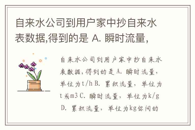 自来水公司到用户家中抄自来水表数据,得到的是 A. 瞬时流量,单位为t/h B. 累积流量,单位为t或m3 C. 瞬时流量,单位为k/g D. 累积流量,单位为kg