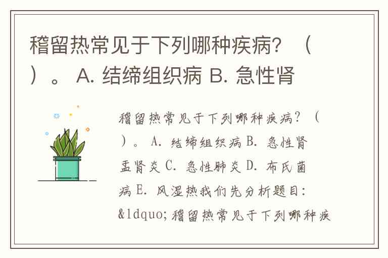 稽留热常见于下列哪种疾病?()。 A. 结缔组织病 B. 急性肾盂肾炎 C. 急性肺炎 D. 布氏菌病 E. 风湿热