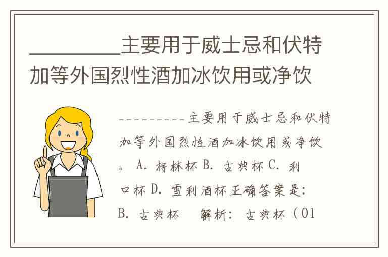 _________主要用于威士忌和伏特加等外国烈性酒加冰饮用或净饮。 A. 柯林杯 B. 古典杯 C. 利口杯 D. 雪利酒杯