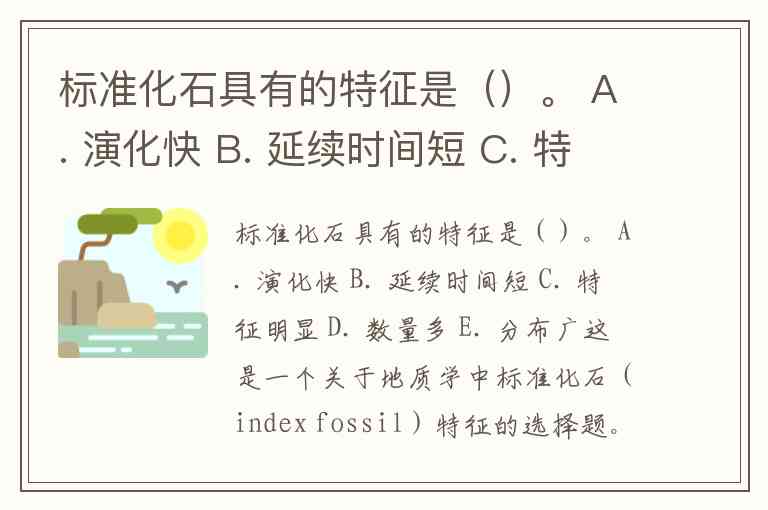 标准化石具有的特征是()。 A. 演化快 B. 延续时间短 C. 特征明显 D. 数量多 E. 分布广