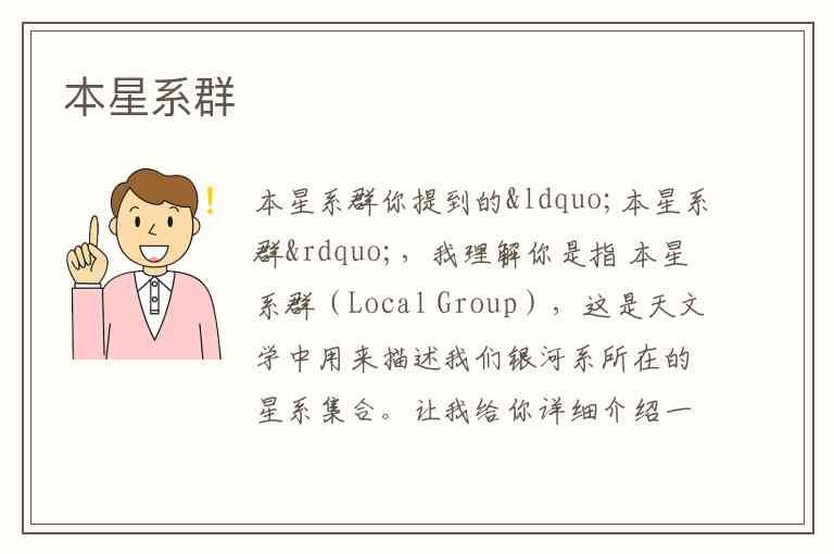 你提到的“本星系群”,我理解你是指 本星系群(Local Group),这是天文学中用来描述我们银河系所在的星系集合。让我给你详细介绍一下: