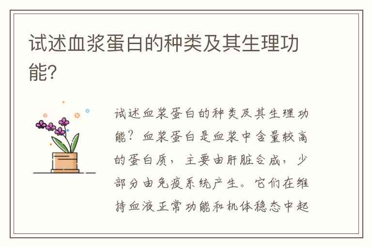血浆蛋白是血浆中含量较高的蛋白质,主要由肝脏合成,少部分由免疫系统产生。它们在维持血液正常功能和机体稳态中起着重要作用。下面我将从种类和生理功能两个方面进行详细阐述。