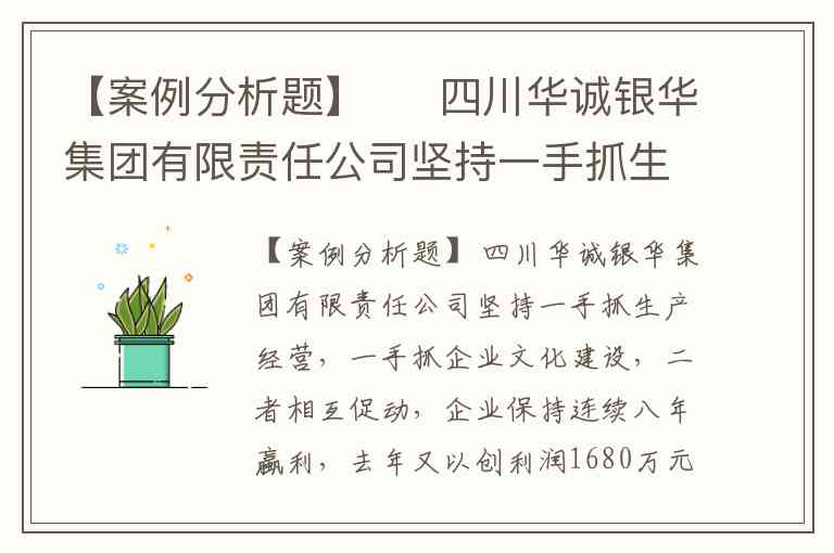 【案例分析题】 四川华诚银华集团有限责任公司坚持一手抓生产经营,一手抓企业文化建设,二者相互促动,企业保持连续八年蠃利,去年又以创利润1680万元居省纺织行业第二位;保持了省优秀企业、省文明单位称号,创全国模范职工之家获得成功。 (一)认识到位。银华公司位于四川盆地中部射洪县,写“前不见古人”的陈子昂与酿“悠悠岁月酒”的沱牌公司是其亮丽之处。随着经济体制改革的深化,银华这个棉纺织企业同大多数国有纺织企业一样,企业管理和发展出现了严重困难,问题的根源是什么?出路又何在?公司调查分析后认为,社会的巨大变革、企业生存空间和职工心态的变化,使得计划经济时代形成的理念、制度、方法已成为桎梏,必须以改革的精神,把创建先进的企业文化引入经营管理。 高度的重视带来了自觉的行动。九十年代初至今,银华都把企业文化建设摆在头等位置常抓不懈。公司董事长、党委书记、总经理胥明东说:“知识经济时代最显着的特征就是文化对生 起着巨大的促进作用。创建企业文化形成的文化力如凝聚力、创造力等是公司宝贵的无形资产。在新的世纪,拥有这种文化优势,也就拥有竞争优势。”因而,全公司各部门高度一致,一把手抓两手,两手都要硬。 (二)机制到位。任何工作仅靠自觉是不够的。银华公司创建企业文化狠抓了各种机制的建立和完善。首先,考核机制。加强考核是企业文化建设由虚变实、由软变硬的重要手段。结合企业实际,银华公司出台了15个实施细则,实行量化考核。其次,民主管理监督机制。公司把企业的 量、质量、销售收入、利润、成本、费用、发展规划等重大情况定期公布,经过摸索形成公司、分厂(部门)、轮班三级公开制度,职工对应知的事情了如指掌。再次是完善分配制度,各个岗位元的工作全部量化,职工对照公开栏公布的个人奖扣、 质等情况就能算出自己本月收入。三是人才选拨机制。银华坚持实施四个工程,即引进一批、自学成才一批、联合办学培训一批、送大专院校深造一批,仅九五期间就造就人才560人。在选择使用上,公司坚持德才兼备的原则,面向市场竞争择优,实行公推公选制度。 (三)教育到位。银华公司认企业文化的核心是培育先进的企业精神,并在职工的工作中得到体现,培育的途径则是教育。(1)企业精神是企业文化的灵魂。经过长期积累和不断总结提炼,银华公司形成勤奋、求实、开拓、创新的企业精神。职工日常行为是企业文化的具体体现。银华公司注重引导和规范。首先,要求各级党组织和管理人员务必掌握各自负责的情况,准确把握企业总体情况和职工具体情况。其次,以先进典型引导群体行为。公司建立劳模培养制度,每年评选百名劳模,年初各部门报培养物件,对培养物件的数量、质量等工作情况和思想动态月月追踪,及时向本人反馈意见和建议。公司还常年开展巾帼建功、百千万无疵、操作明星、党员先锋、双争等竞赛。(2)抓住学习不放松。公司按照学习型企业的要求改造企业。坚持政治学习,每月两次。公司年年都有职工培训规划,月、季有落实,操作技术培训、成本核算培训、通讯报道员培训、纺织基础培训等贯穿全年始终,形式多样、特色鲜明。 (四)投入到位。银华公司胥总认为,企业文化建设之所以叫做一把手工程,是因它同经济工作一样,投入是关键,没有投入就没有出。(1)投入包括人、财、物。公司虽然近几年大幅精简非生 人员,但政工线的力量并没有削弱,相反还得到加强。公司有从事文化建设的职能部门和人员,分厂有专职总支、支部副书记、分工会主席、政工干事,各司其职、各负其责,党政工团齐抓共管。(2)银华公司始终坚持按比例投入企业文化阵地建设。仅九五期间,公司就投资450馀万元,先後实施厂门形象工程、生 区绿化工程、生活区亮化美化工程、厂区道路硬化工程、生 现场蜂窝除尘工程、锅炉脱硫除尘工程等专案,厂大门内外宽敞整洁、气势宏伟,蓝底白字的企业精神、质量方针、质量承诺牌巍然耸立,宣传橱窗色彩斑斓,阅报栏几十张最新的报纸供人阅读,黑板报写着各班职工奖惩及质量数据。入夜,生活区、职工活动中心、图书阅览室霓虹闪烁、一片通明。形成了独具银华特色的企业文化氛围。 银华公司是怎样认识到企业文化的作用的?