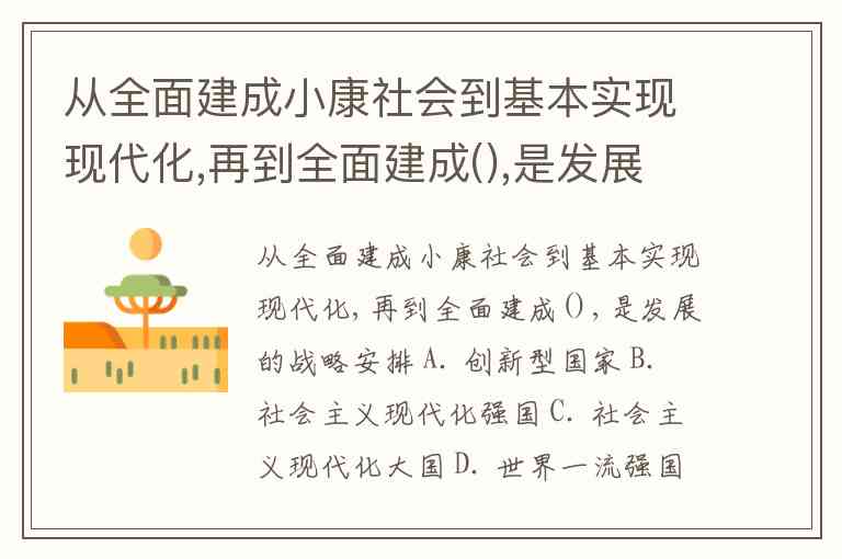从全面建成小康社会到基本实现现代化,再到全面建成(),是发展的战略安排 A. 创新型国家 B. 社会主义现代化强国 C. 社会主义现代化大国 D. 世界一流强国