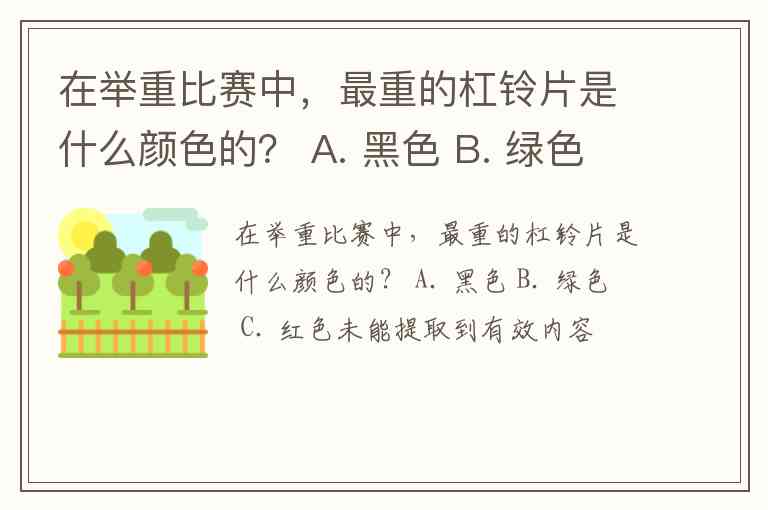 在举重比赛中,最重的杠铃片是什么颜色的? A. 黑色 B. 绿色 C. 红色