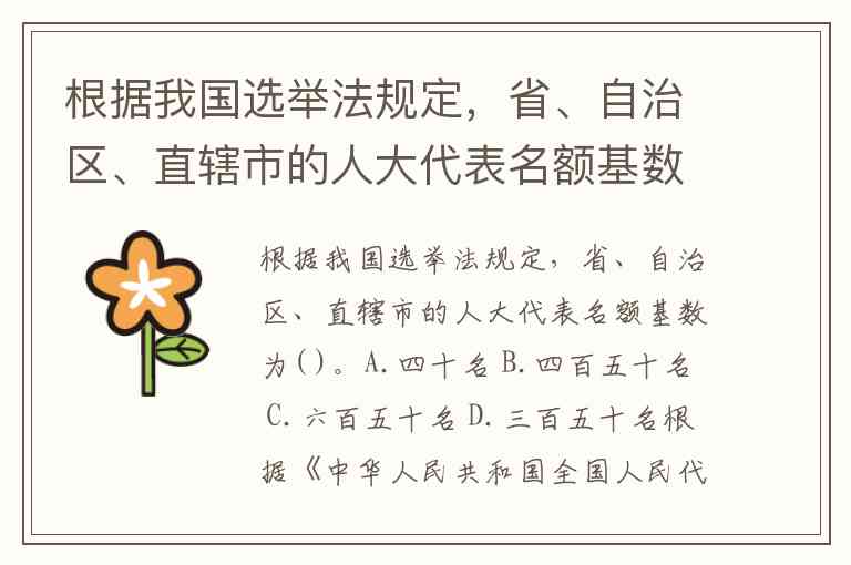 根据我国选举法规定,省、自治区、直辖市的人大代表名额基数为( )。A.四十名 B.四百五十名 C.六百五十名 D.三百五十名