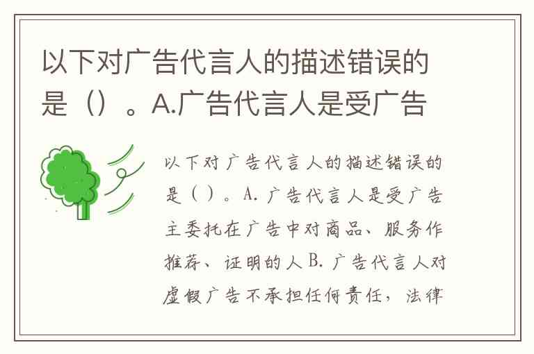 以下对广告代言人的描述错误的是()。A.广告代言人是受广告主委托在广告中对商品、服务作推荐、证明的人 B.广告代言人对虚假广告不承担任何责任,法律责任应该由广告主承担 C.广告代言人应该使用过代言的商品或接受过代言的服务 D.未满十周岁的未成年人不能作为广告代言人