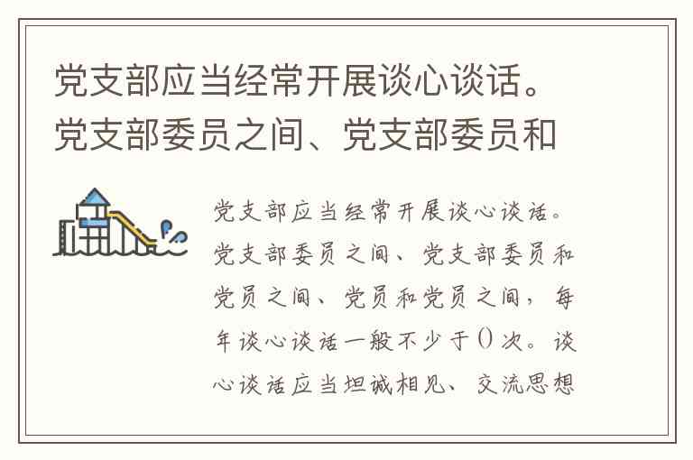 根据《中国共产党支部工作条例(试行)》及相关党建规范,党支部委员之间、党支部委员和党员之间、党员和党员之间的谈心谈话每年一般不少于1次,谈话需围绕思想交流、意见交换和互助提升展开。同时,党支部应注重分析党员的思想状况和心理状态,对家庭变故、重大困难、身心健康问题或受处分的党员,需针对性开展心理疏导和思想政治工作。这一制度设计既强化了党内政治生活的规范性,也体现了组织对党员个体的人文关怀。