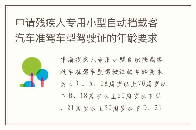 申请残疾人专用小型自动挡载客汽车准驾车型驾驶证的年龄要求为()。A、18周岁以上70周岁以下 B、18周岁以上60周岁以下 C、21周岁以上50周岁以下 D、21周岁以上60周岁以下