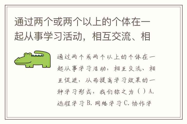 通过两个或两个以上的个体在一起从事学习活动,相互交流、相互促进,从而提高学习效果的一种学习形式,我们称之为()A.远程学习 B.网络学习 C.协作学习 D.共同学习