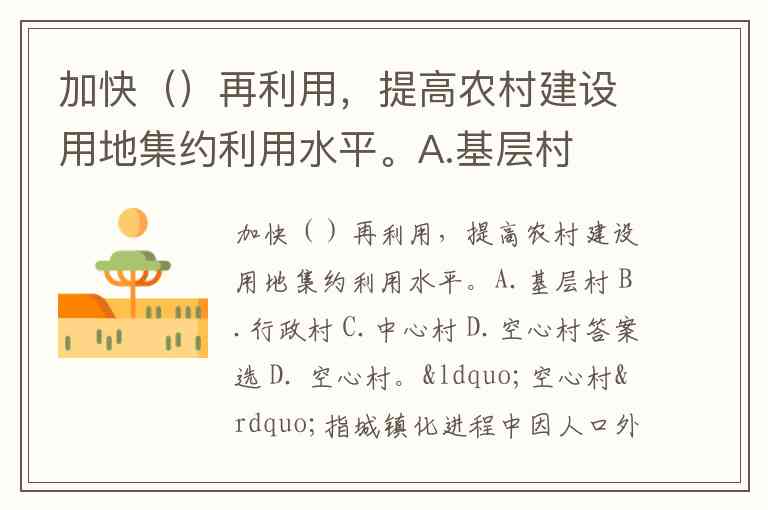 加快()再利用,提高农村建设用地集约利用水平。A.基层村 B.行政村 C.中心村 D.空心村