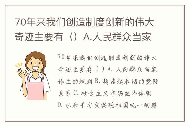 70年来我们创造制度创新的伟大奇迹主要有()A.人民群众当家作主的权利 B.构建起和谐的党际关系 C.社会主义市场经济体制 D.以和平方式实现祖国统一的崭新道路