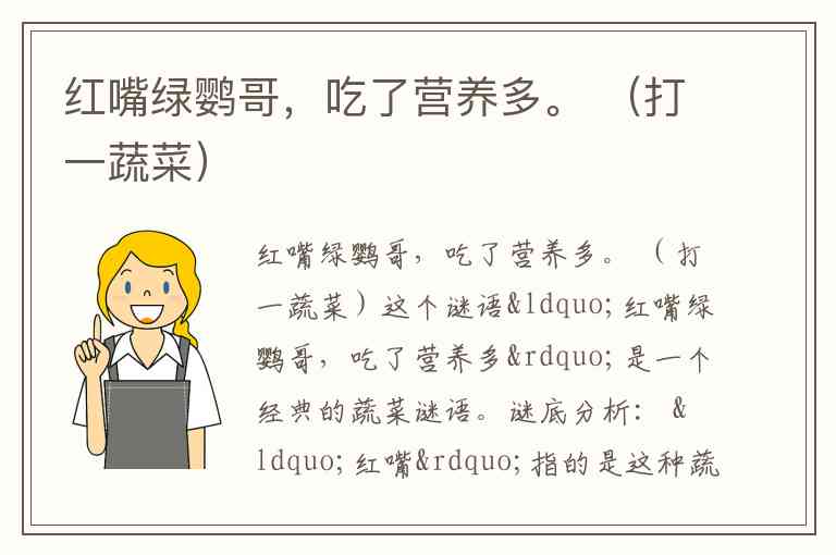 这个谜语“红嘴绿鹦哥,吃了营养多”是一个经典的蔬菜谜语。