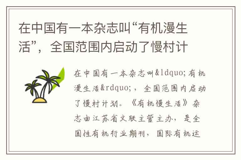 《有机慢生活》杂志由江苏省文联主管主办,是全国性有机行业期刊,国际有机运动联盟(IFOAM)驻亚洲代表周泽江担任总顾问,月发行量3万册,旨在推动有机产业永续发展,倡导健康生活理念。其发起的“慢村计划”已被证实存在,相关表述在2019年贵州大生态公需科目考试题库中被明确认定为正确。