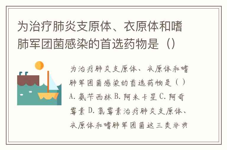 为治疗肺炎支原体、衣原体和嗜肺军团菌感染的首选药物是()A.氨苄西林 B.阿米卡星 C.阿奇霉素 D.氯霉素
