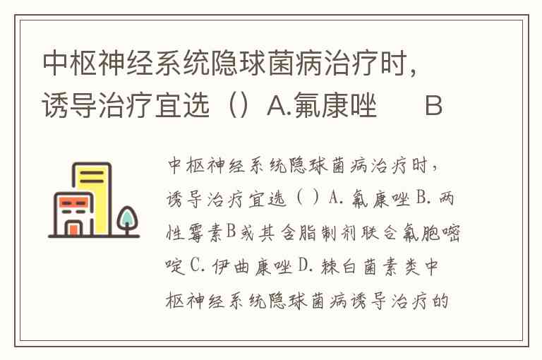 中枢神经系统隐球菌病治疗时,诱导治疗宜选()A.氟康唑 B.两性霉素B或其含脂制剂联合氟胞嘧啶 C.伊曲康唑 D.棘白菌素类