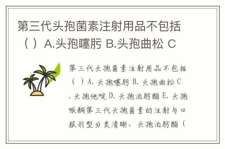 第三代头孢菌素注射用品不包括( )A.头孢噻肟 B.头孢曲松 C.头孢他啶 D.头孢泊肟酯 E.头孢哌酮