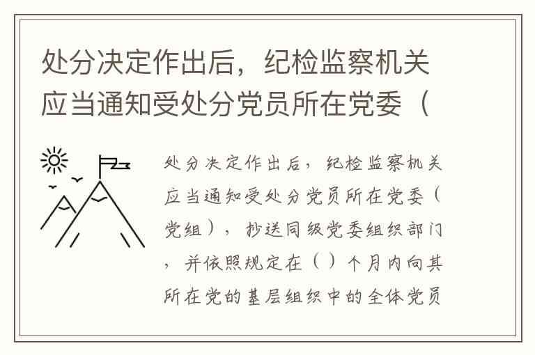 处分决定作出后,纪检监察机关应当通知受处分党员所在党委(党组),抄送同级党委组织部门,并依照规定在()个月内向其所在党的基层组织中的全体党员以及本人宣布,处分决定执行情况应当及时报告。A.1 B.2 C.3 D.4