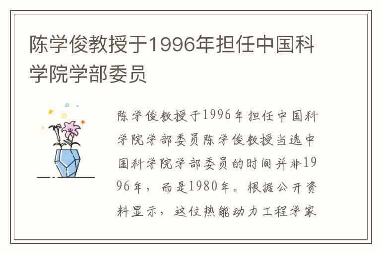 陈学俊教授当选中国科学院学部委员的时间并非1996年,而是1980年。根据公开资料显示,这位热能动力工程学家在1980年当选为中国科学院学部委员(院士),1996年则是当选为第三世界科学院(现称发展中国家科学院)院士。这一时间线差异反映了他在不同阶段获得的学术荣誉:前者是国内最高学术称号,后者是国际科技组织对其全球影响力的认可。