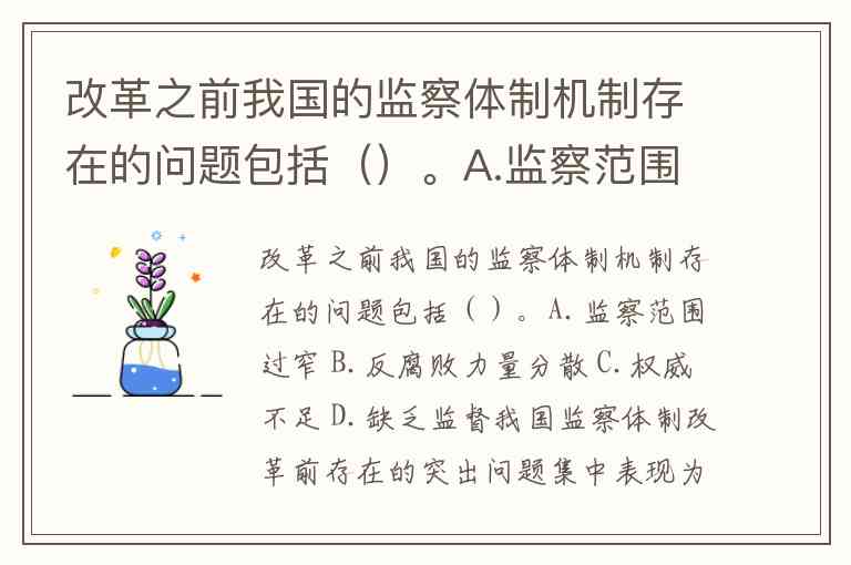 改革之前我国的监察体制机制存在的问题包括()。A.监察范围过窄 B.反腐败力量分散 C.权威不足 D.缺乏监督