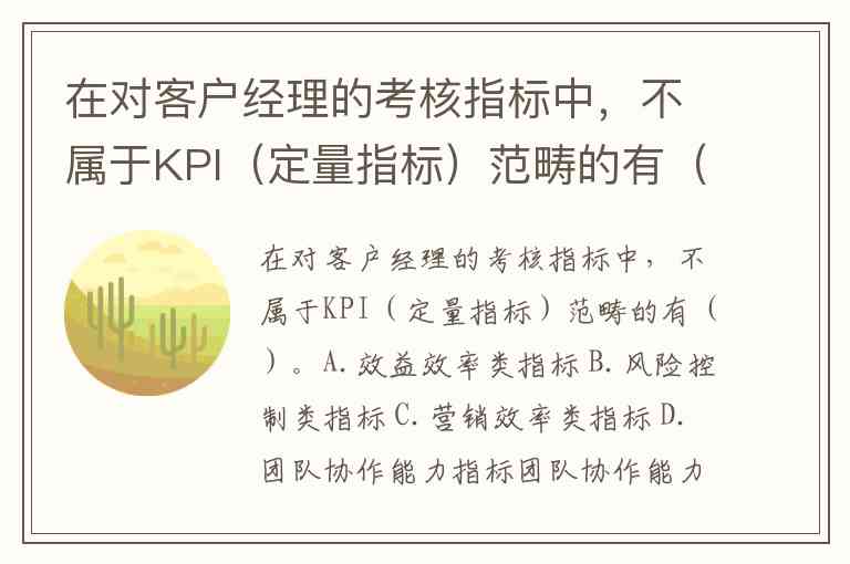 在对客户经理的考核指标中,不属于KPI(定量指标)范畴的有()。A.效益效率类指标 B.风险控制类指标 C.营销效率类指标 D.团队协作能力指标