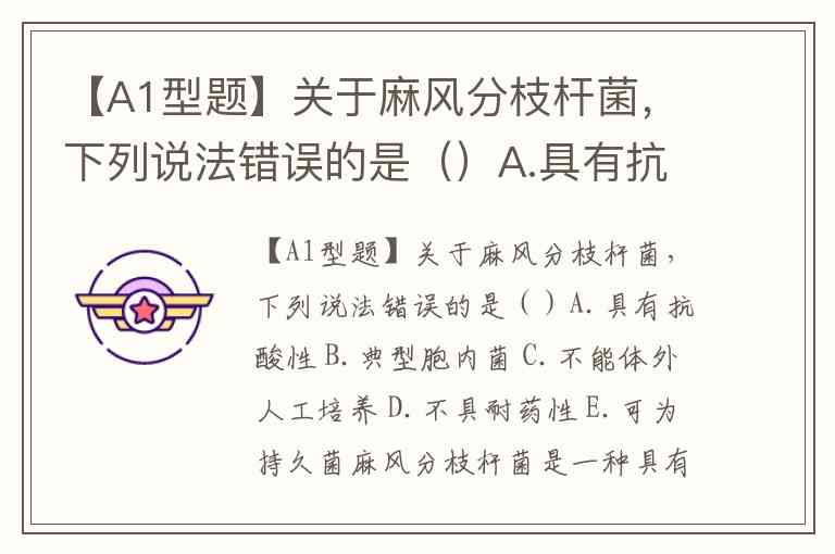 【A1型题】关于麻风分枝杆菌,下列说法错误的是()A.具有抗酸性 B.典型胞内菌 C.不能体外人工培养 D.不具耐药性 E.可为持久菌