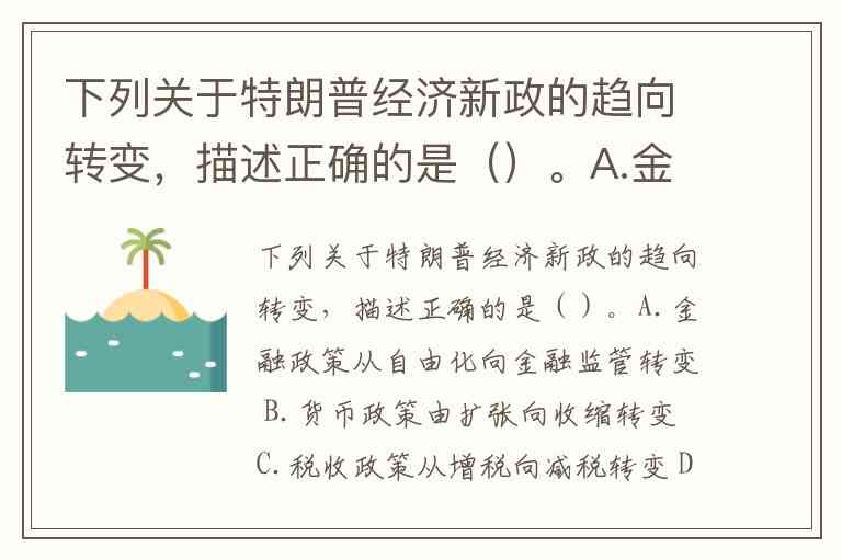 下列关于特朗普经济新政的趋向转变,描述正确的是()。A.金融政策从自由化向金融监管转变 B.货币政策由扩张向收缩转变 C.税收政策从增税向减税转变 D.财政政策从扩张向收缩转变
