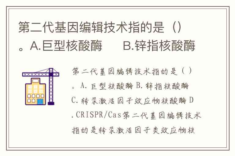 第二代基因编辑技术指的是()。A.巨型核酸酶 B.锌指核酸酶 C.转录激活因子效应物核酸酶 D.CRISPR/Cas
