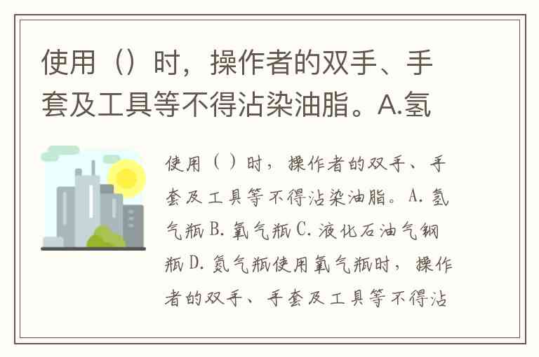 使用()时,操作者的双手、手套及工具等不得沾染油脂。A.氢气瓶 B.氧气瓶 C.液化石油气钢瓶 D.氮气瓶
