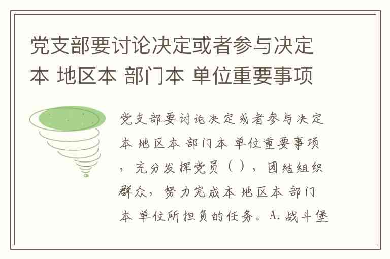 党支部要讨论决定或者参与决定本 地区本 部门本 单位重要事项,充分发挥党员(),团结组织群众,努力完成本 地区本 部门本 单位所担负的任务。A.战斗堡垒作用 B.先锋模范作用 C.典型模范作用