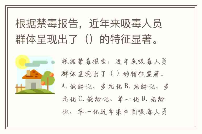 根据禁毒报告,近年来吸毒人员群体呈现出了()的特征显著。A.低龄化、多元化 B.老龄化、多元化 C.低龄化、单一化 D.老龄化、单一化