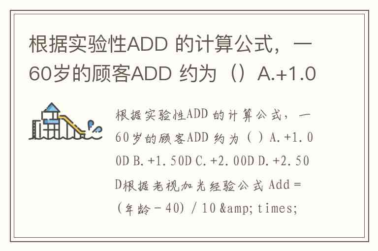 根据实验性ADD 的计算公式,一60岁的顾客ADD 约为()A.+1.00D B.+1.50D C.+2.00D D.+2.50D