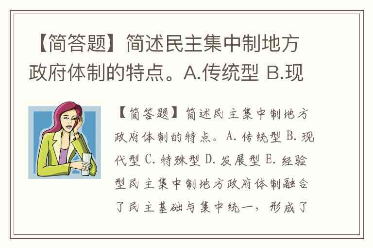【简答题】简述民主集中制地方政府体制的特点。A.传统型 B.现代型 C.特殊型 D.发展型 E.经验型