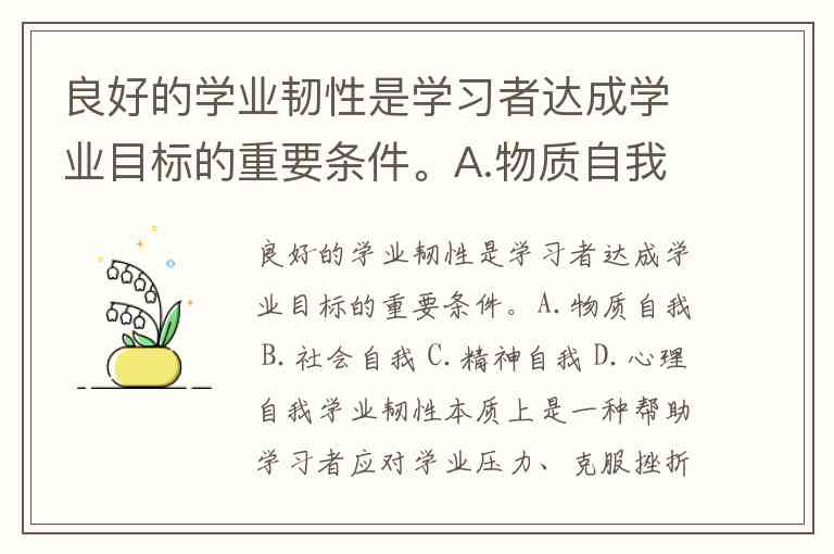 良好的学业韧性是学习者达成学业目标的重要条件。A.物质自我 B.社会自我 C.精神自我 D.心理自我