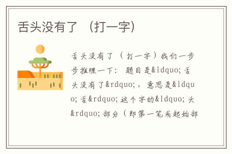 我们一步步推理一下: 题目是“舌头没有了”,意思是“舌”这个字的“头”部分(即第一笔或起始部分)没有了。