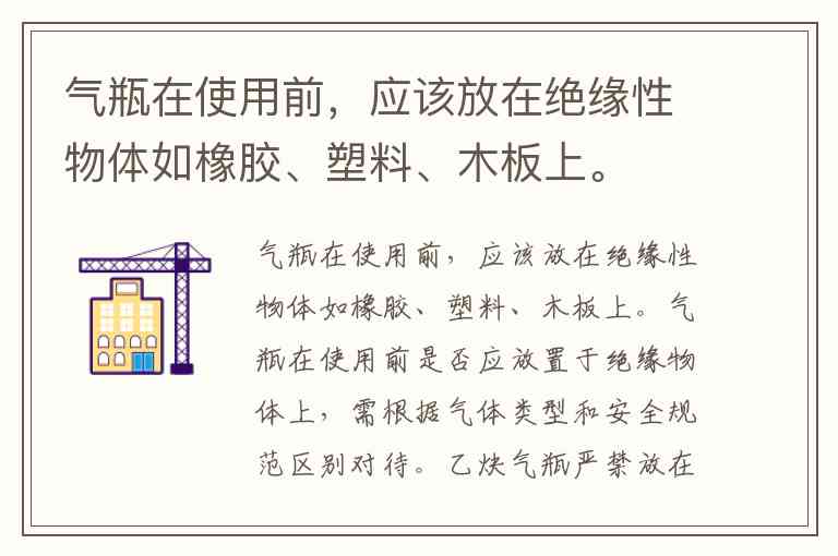 气瓶在使用前是否应放置于绝缘物体上,需根据气体类型和安全规范区别对待。乙炔气瓶严禁放在橡胶等绝缘体上,而其他气体气瓶在特定场景下可能需要绝缘措施。