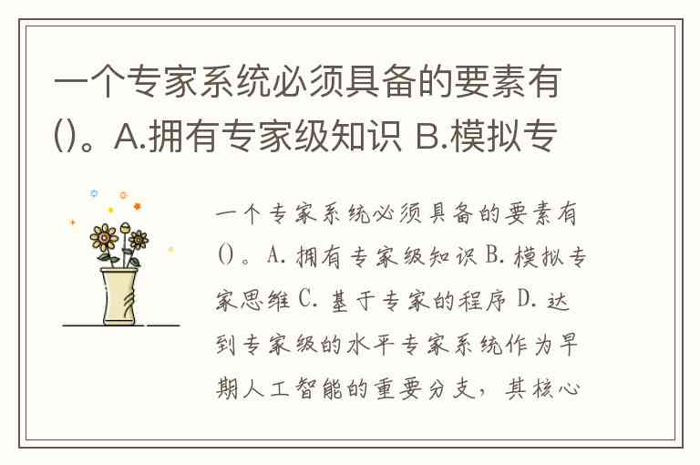 一个专家系统必须具备的要素有()。A.拥有专家级知识 B.模拟专家思维 C.基于专家的程序 D.达到专家级的水平