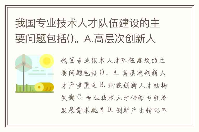 我国专业技术人才队伍建设的主要问题包括 A.高层次创新人才严重匮乏、B.科技创新人才结构失衡、C.专业技术人才供给与经济发展需求脱节 和 E.“以人为本”的观念仍未完全树立。这些问题相互交织,共同制约着人才创新活力的释放。