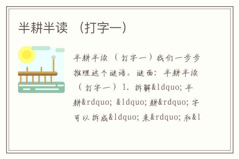 谜面:半耕半读 (打字一) 1. 拆解“半耕” “耕”字可以拆成“耒”和“井”。