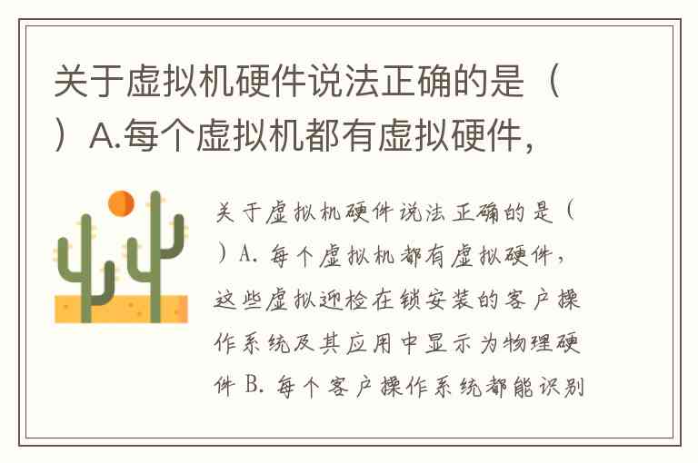 关于虚拟机硬件说法正确的是()A.每个虚拟机都有虚拟硬件,这些虚拟迎检在锁安装的客户操作系统及其应用中显示为物理硬件 B.每个客户操作系统都能识别出常规硬件设备,但他并不知道这些设备实际上是虚拟设备 C.虚拟机具有统一的硬件 D.统一硬件是的虚拟机可以跨vsphere主机进行迁移
