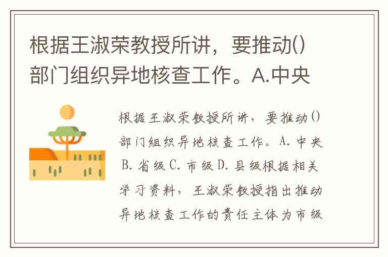 根据王淑荣教授所讲,要推动()部门组织异地核查工作。A.中央 B.省级 C.市级 D.县级