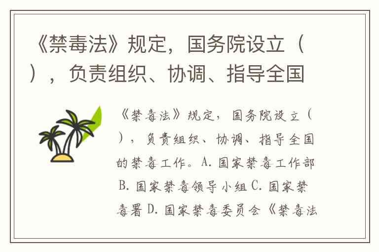 《禁毒法》规定,国务院设立(),负责组织、协调、指导全国的禁毒工作。A.国家禁毒工作部 B.国家禁毒领导小组 C.国家禁毒署 D.国家禁毒委员会