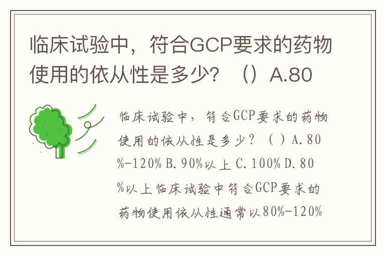 临床试验中,符合GCP要求的药物使用的依从性是多少?()A.80%-120% B.90%以上 C.100% D.80%以上