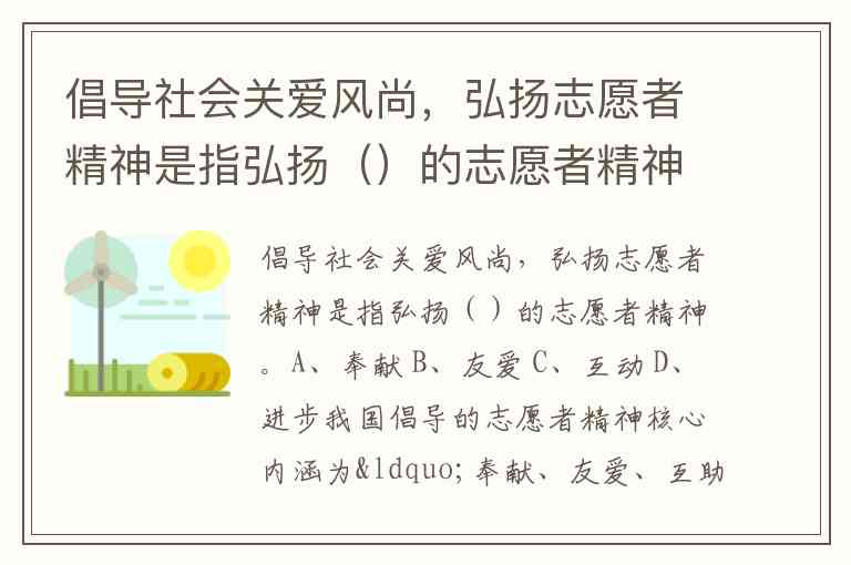 倡导社会关爱风尚,弘扬志愿者精神是指弘扬()的志愿者精神。A、奉献 B、友爱 C、互动 D、进步