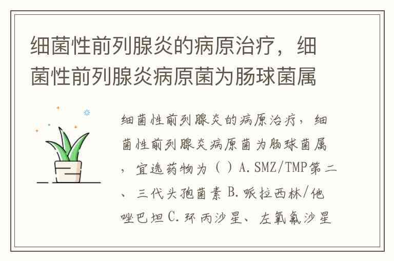 细菌性前列腺炎的病原治疗,细菌性前列腺炎病原菌为肠球菌属,宜选药物为()A.SMZ/TMP第二、三代头孢菌素 B.哌拉西林/他唑巴坦 C.环丙沙星、左氧氟沙星、头孢他啶 D.氨苄西林/舒巴坦、阿莫西林/克拉维酸