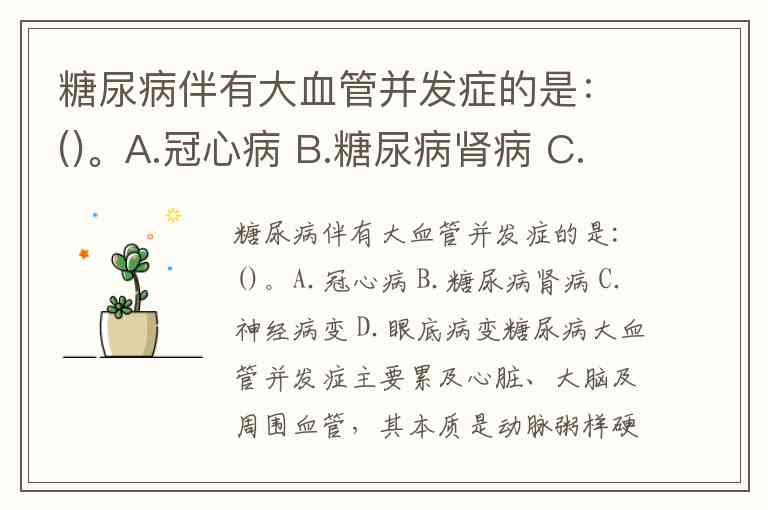 糖尿病伴有大血管并发症的是:()。A.冠心病 B.糖尿病肾病 C.神经病变 D.眼底病变