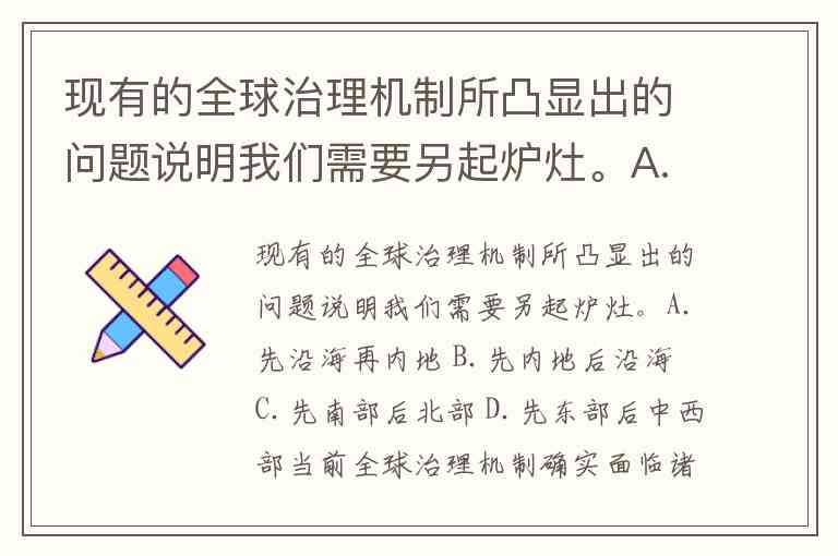 现有的全球治理机制所凸显出的问题说明我们需要另起炉灶。A.先沿海再内地 B.先内地后沿海 C.先南部后北部 D.先东部后中西部